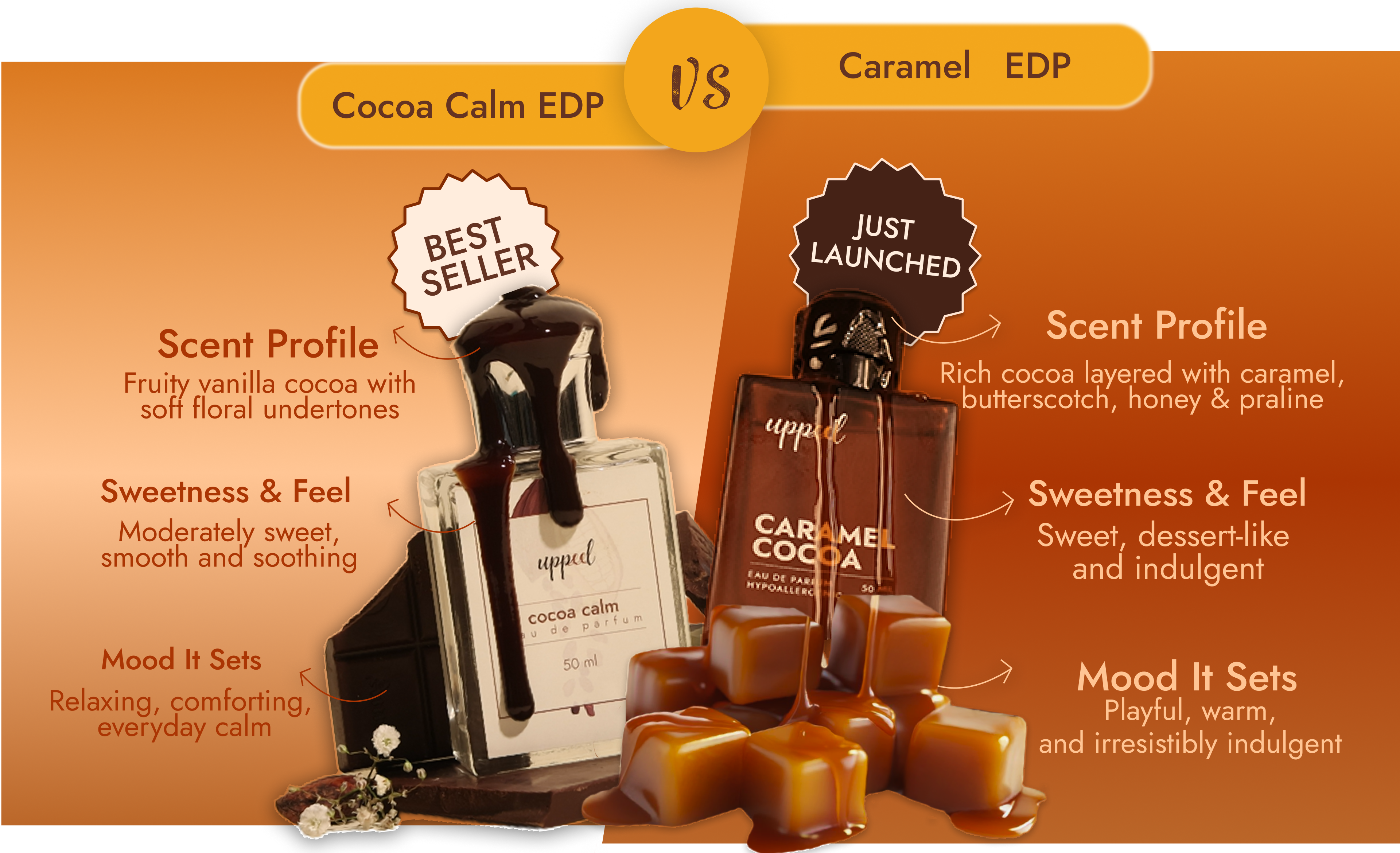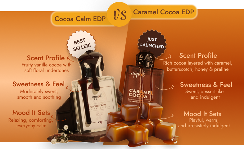 Caramel Cocoa is more caramelly, with rich, buttery sweetness leading the fragrance. Cocoa adds warmth and depth, making it a balanced Caramel Cocoa perfume for women rather than an overpowering chocolate flavour perfume.
